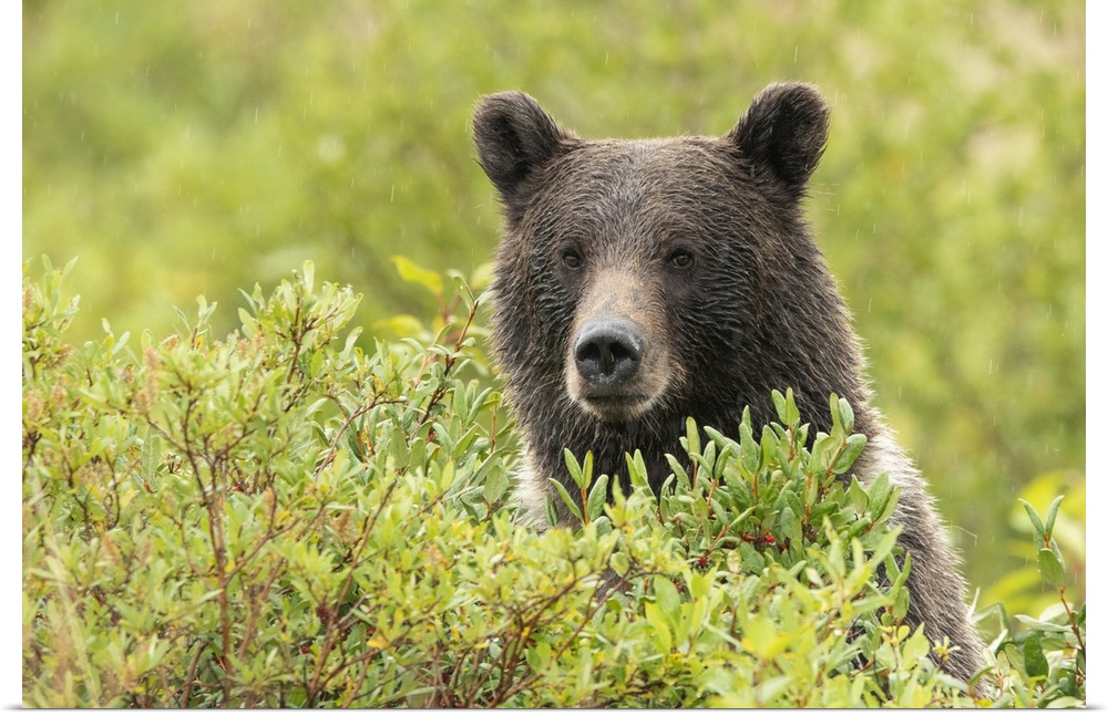 <p>Grizzly bear (ursus arctos horribilis) looking out from behind foliage along the roadside, Dawson city, British Columbia, Canada.</p>