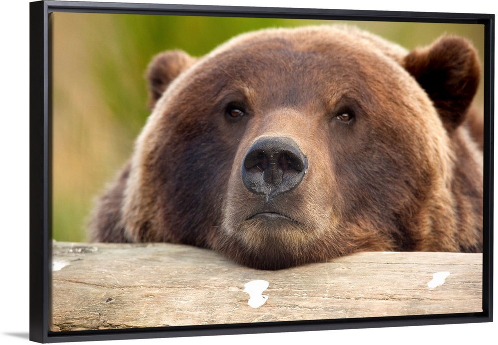 <p>Grizzly bear rests its head on a log at the Alaska Wildlife Conservation Center, Southcentral Alaska</p>