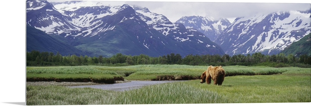 <p>Panoramic photograph of brown bear walking through meadow of grass toward a small lake with forest line and snow covered mountains in the distance.</p>
