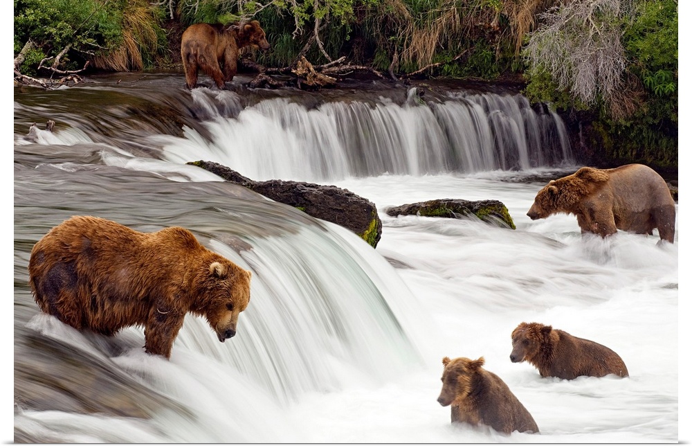 <p>Big canvas print of brown bears trying to catch fish near a small waterfall in the forest.</p>