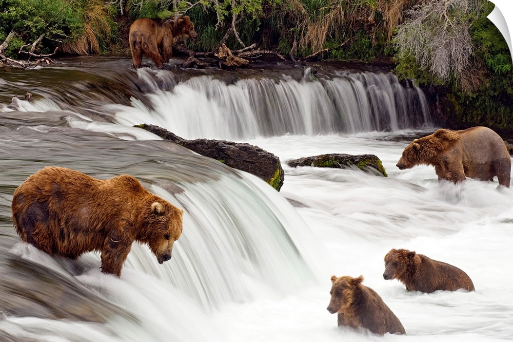 <p>Big canvas print of brown bears trying to catch fish near a small waterfall in the forest.</p>