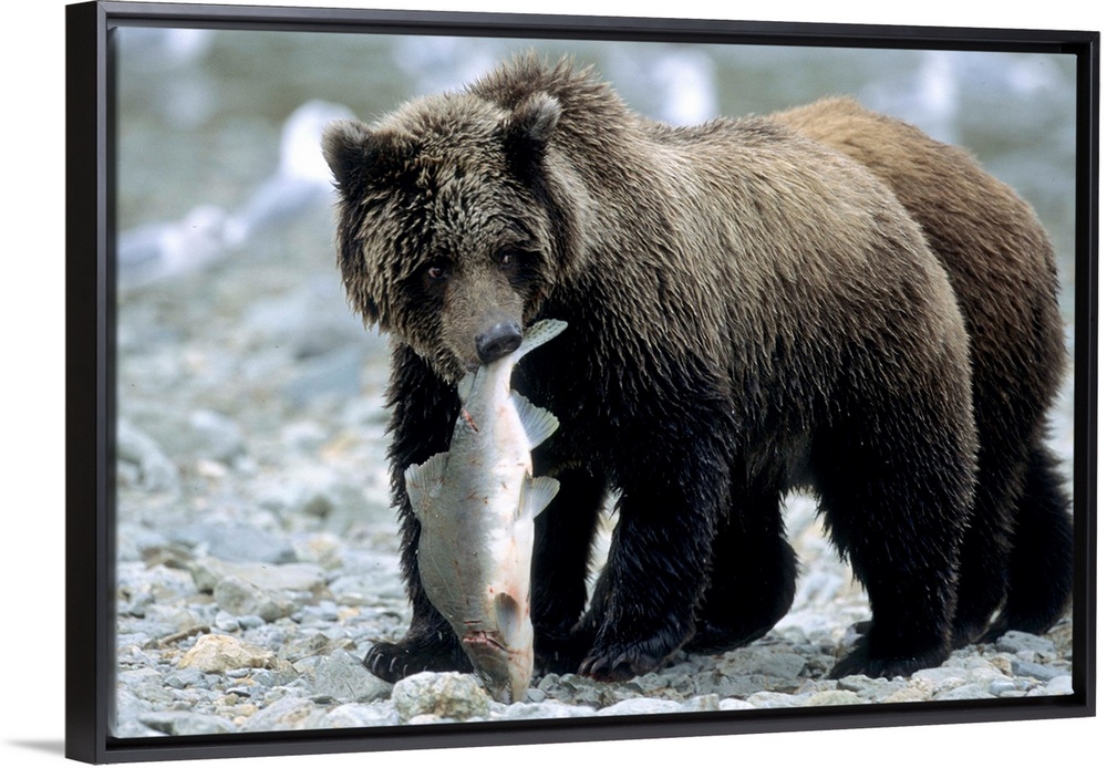 <p>Grizzly Cub carrying Salmon in his Mouth, U.S.A., Alaska, Katmai Peninsula</p>