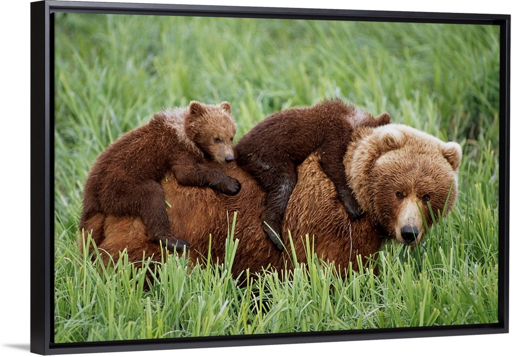 <p>Grizzly Cubs Ride On Top Of Their Mother As She Walking Through Grass Near Mcneil River. Summer In Southwest Alaska.</p>