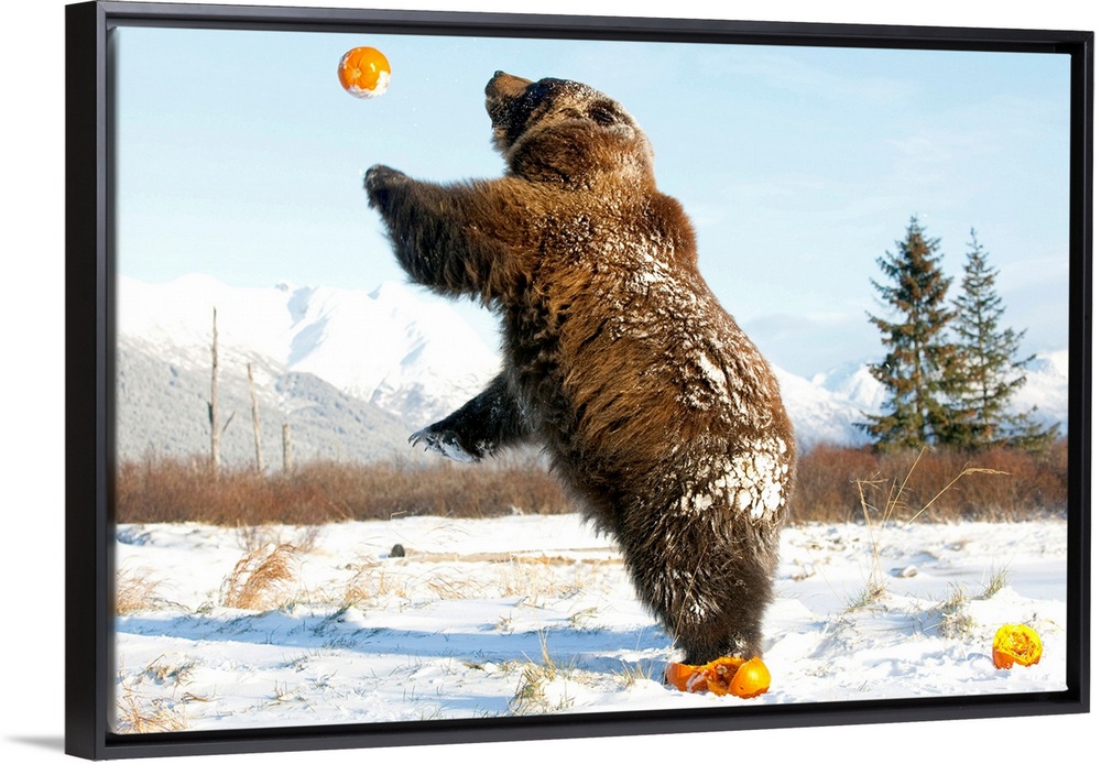 <p>Grizzly plays with pumpkins by throwing them in the air at the Alaska Wildlife Conservation Center, Southcentral Alaska during Winter</p>