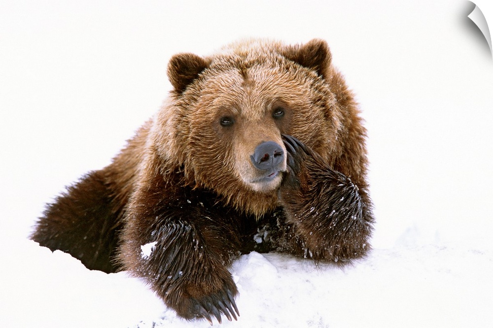 <p>A large brown bear is photographed laying in the snow with its paw resting on its cheek.</p>