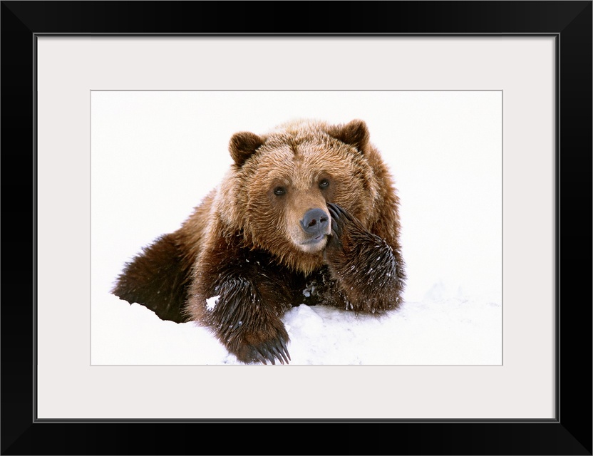 <p>A large brown bear is photographed laying in the snow with its paw resting on its cheek.</p>