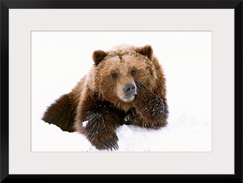 <p>A large brown bear is photographed laying in the snow with its paw resting on its cheek.</p>