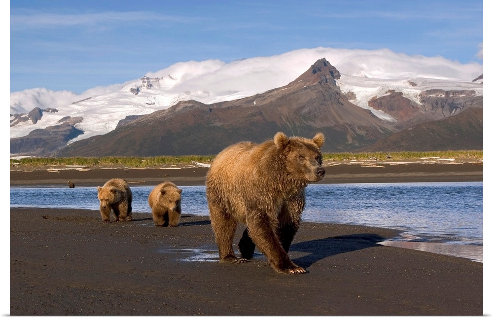 <p>Brown bear (Ursus arctos) sow and cubs walk along river in intertidal area at low tide, looking for salmon. Peaks and glaciers in background. Hallo Bay, Katmai Coast.Katmai National Park, Alaska.</p>