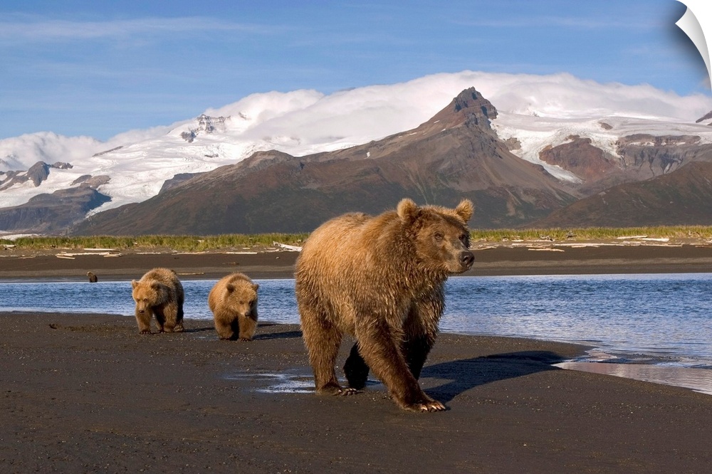 <p>Brown bear (Ursus arctos) sow and cubs walk along river in intertidal area at low tide, looking for salmon. Peaks and glaciers in background. Hallo Bay, Katmai Coast.Katmai National Park, Alaska.</p>
