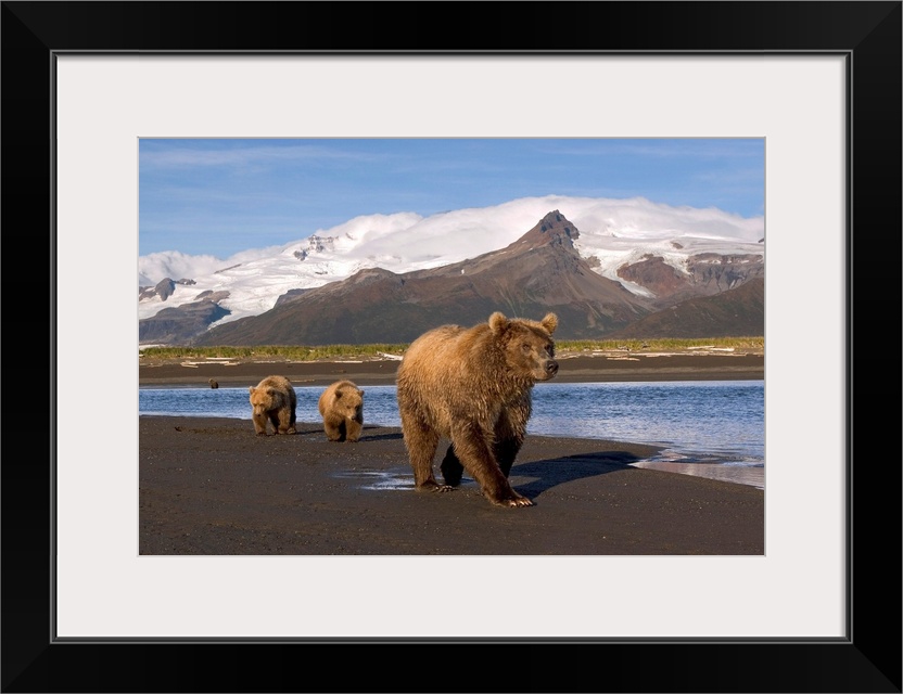 <p>Brown bear (Ursus arctos) sow and cubs walk along river in intertidal area at low tide, looking for salmon. Peaks and glaciers in background. Hallo Bay, Katmai Coast.Katmai National Park, Alaska.</p>