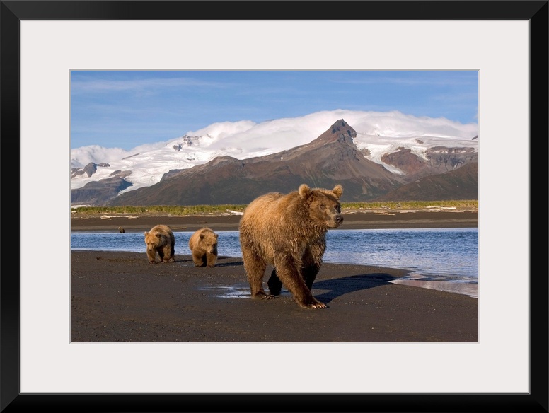 <p>Brown bear (Ursus arctos) sow and cubs walk along river in intertidal area at low tide, looking for salmon. Peaks and glaciers in background. Hallo Bay, Katmai Coast.Katmai National Park, Alaska.</p>