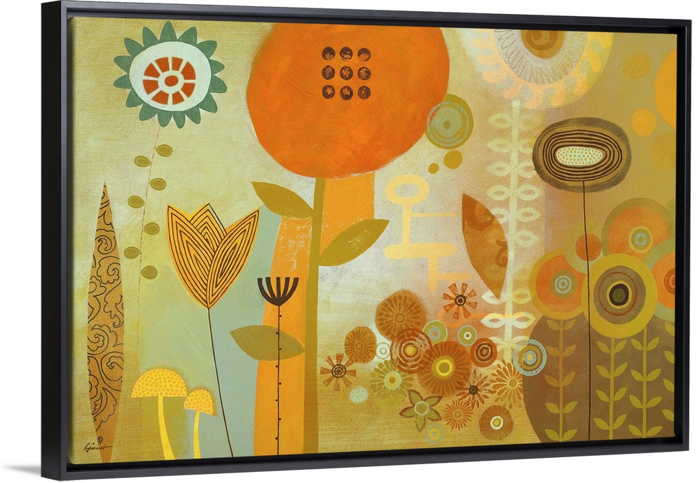 <p>Contemporary painting with a retro feel of colorful shapes and designs making a flowery garden scene.</p>