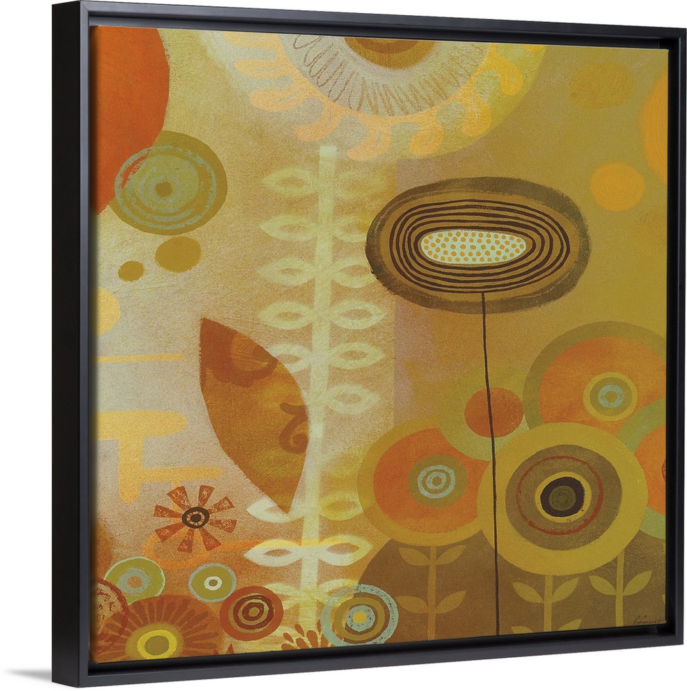 <p>Contemporary painting with a retro feel of colorful shapes and designs making a flowery garden scene.</p>