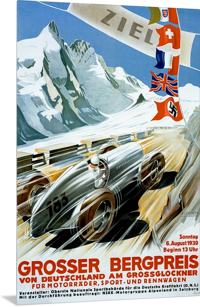 <p>Vertical vintage advertisement on a large canvas for the 1939 Grand Prix in Germany. A racing car streaks toward the finish line, where several countries flags hang, surrounded by a snow covered mountain landscape.</p>