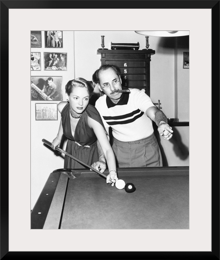 <p>Groucho Marx at home playing billiards with his young wife, Actress Kay Maris in 1949. Her first husband was Actor Leo Gorcey, whom she married when she was 17.</p>