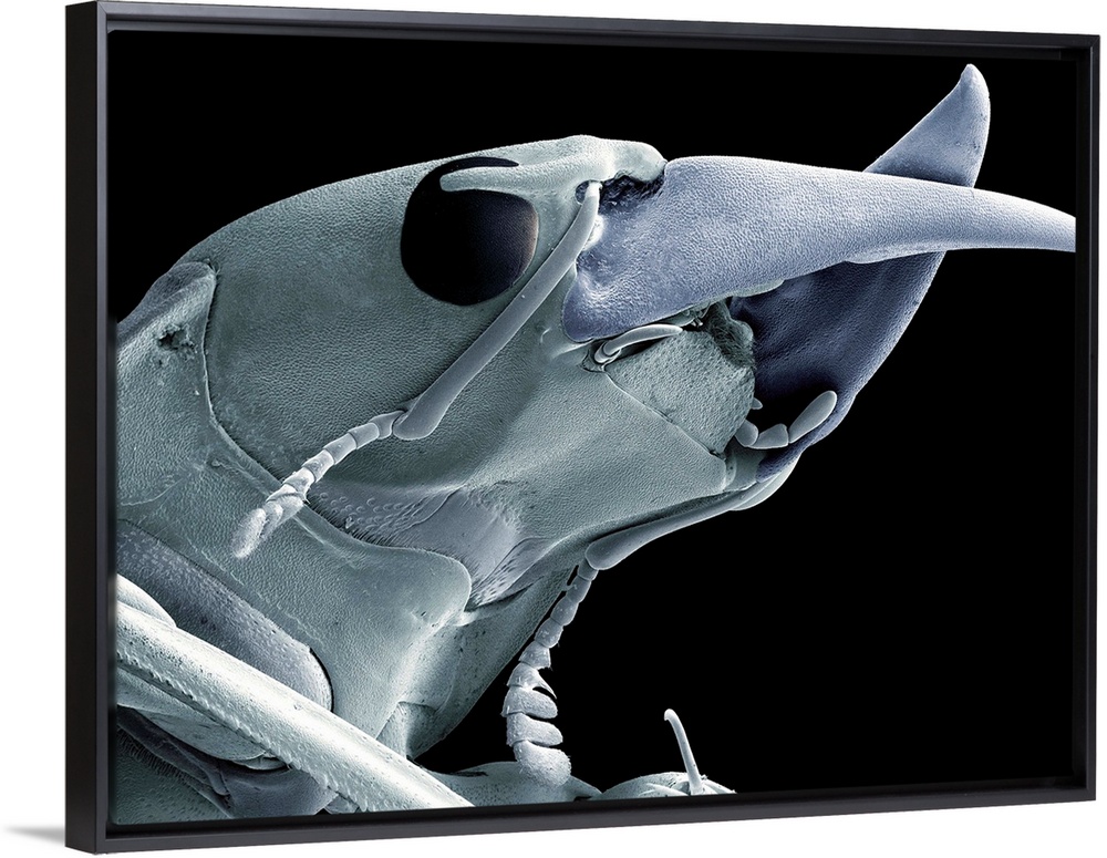 <p>Ground beetle. Coloured scanning electron micrograph (SEM) of the head of a ground beetle (family Carabidae). The beetle's large jaws (mandibles) can be seen at upper right (blue). Most ground beetles are fast-running predators which are active at night. The large jaws are used for catching and eating other invertebrates. They are named ground beetles as they spend most of their time on or under the ground. Magnification x10 when printed at 10 centimetres wide.</p>