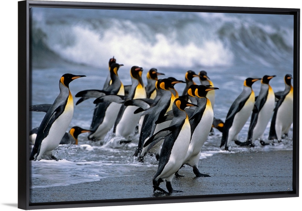 <p>Group of king penguins walking in surf on beach, South Georgia island, Antarctic, summer.</p>