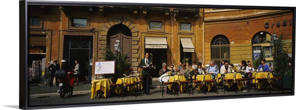 <p>A panoramic view of diners sitting outside a restaurant in Italy.</p>