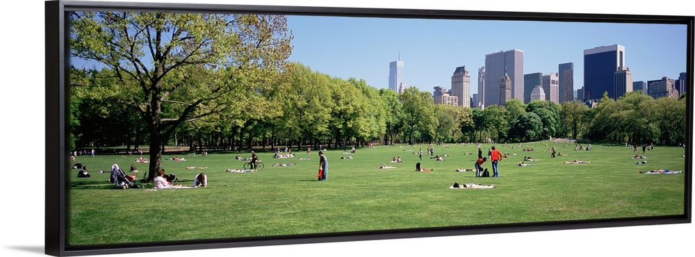 <p>Panoramic view of central park with people relaxing and enjoying the downtown skyline.</p>