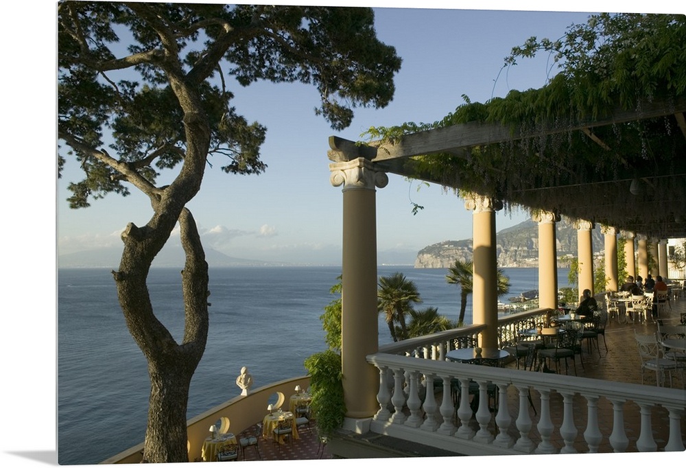 <p>Large photograph displays a few individuals enjoying a meal while sitting within the covered outside portion of an eatery in Europe. The vast open water next to the eatery can be seen extending into the horizon and running past the mountains in the background.</p>