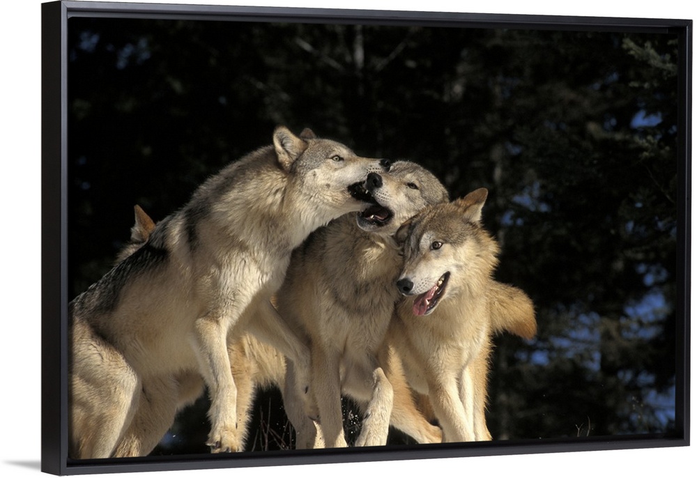 <p>This wildlife photograph shows a pack of wolves rough housing in front of an out of focus forest backdrop.</p>