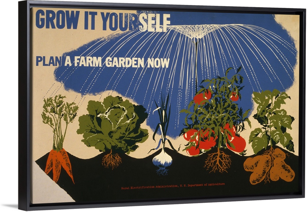 <p>Grow it yourself. Plan a farm garden now. Poster for the U.S. Department of Agriculture promoting victory gardens, showing carrots, lettuce, corn, tomatoes, and potatoes growing. Library of Congress, Prints and Photographs Division, WPA Poster Collection.</p>