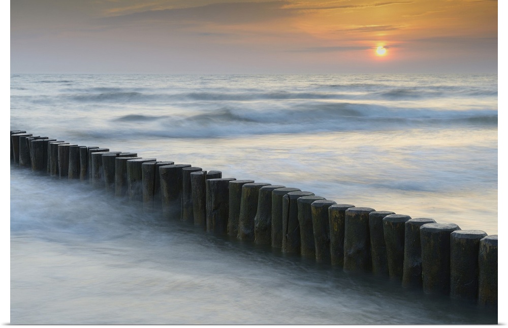 <p>Groyne at Sunrise, Zingst, Darss, Fischland-Darss, Baltic sea, Mecklenburg-Western Pomerania, Germany, Europe</p>