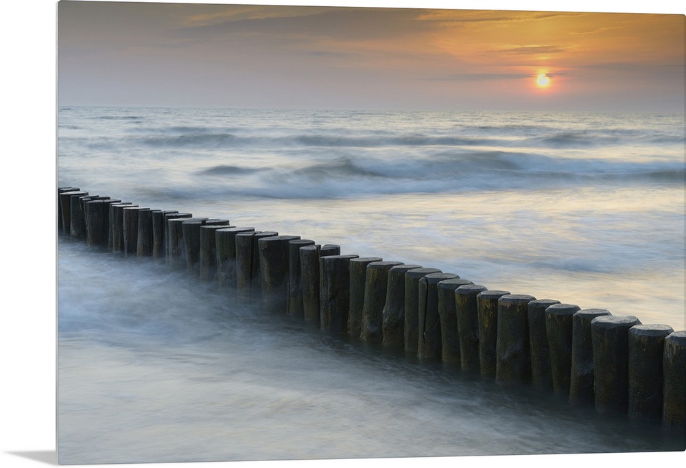 <p>Groyne at Sunrise, Zingst, Darss, Fischland-Darss, Baltic sea, Mecklenburg-Western Pomerania, Germany, Europe</p>