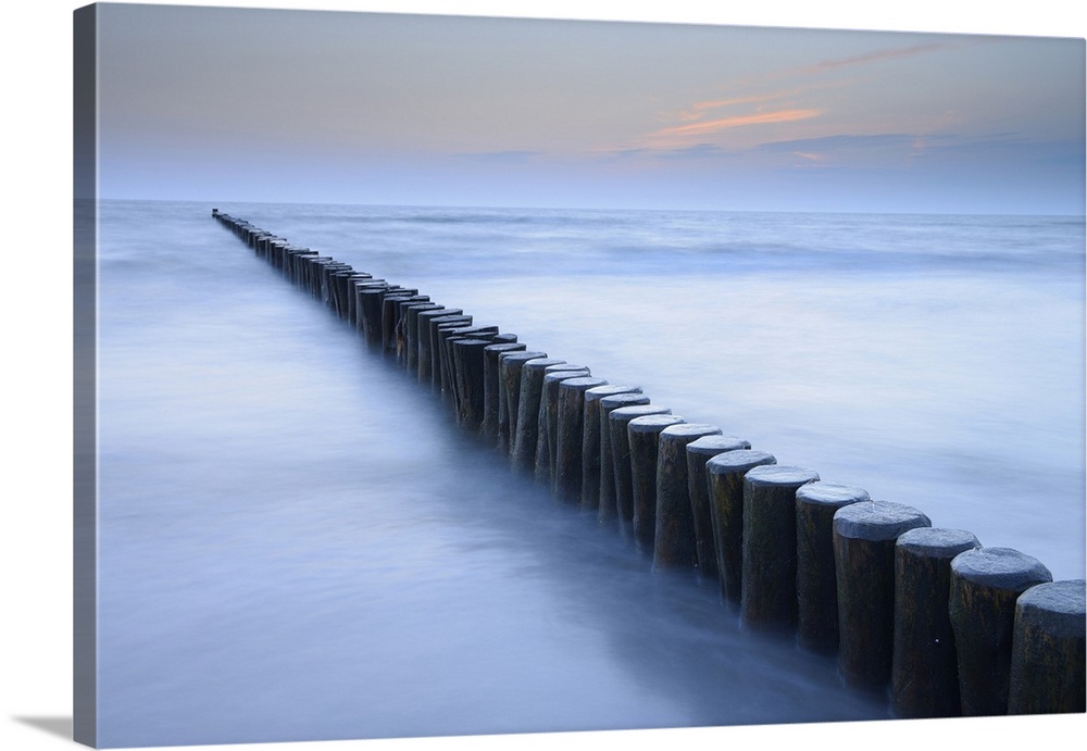 <p>Groyne before sunrise, Zingst, Darss, Fischland-Darss, Baltic sea, Mecklenburg-Western Pomerania, Germany, Europe</p>