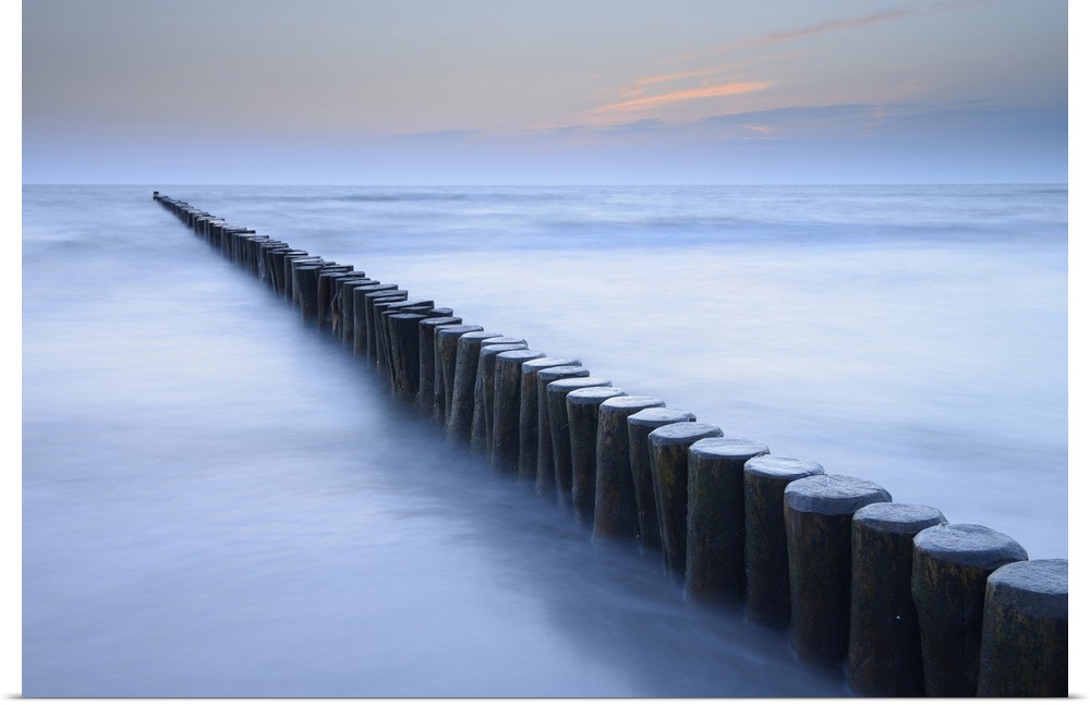 <p>Groyne before sunrise, Zingst, Darss, Fischland-Darss, Baltic sea, Mecklenburg-Western Pomerania, Germany, Europe</p>