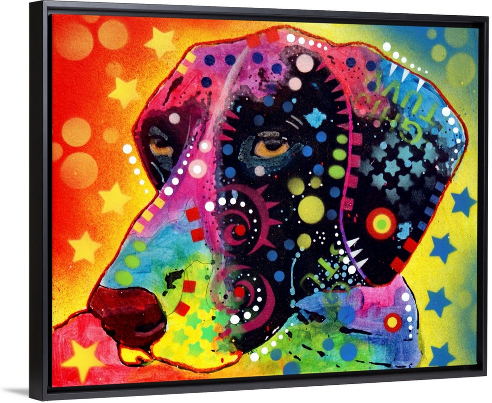 <p>Contemporary stencil painting of a dog filled with various colors and patterns.</p>