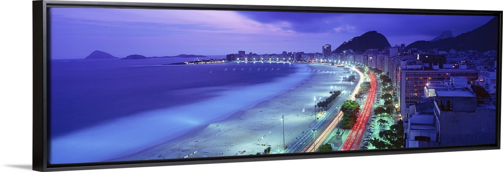 <p>Grand panoramic of Copacabana Beach in Rio de Janeiro at dusk as the cars go speeding by on the beach front road.</p>