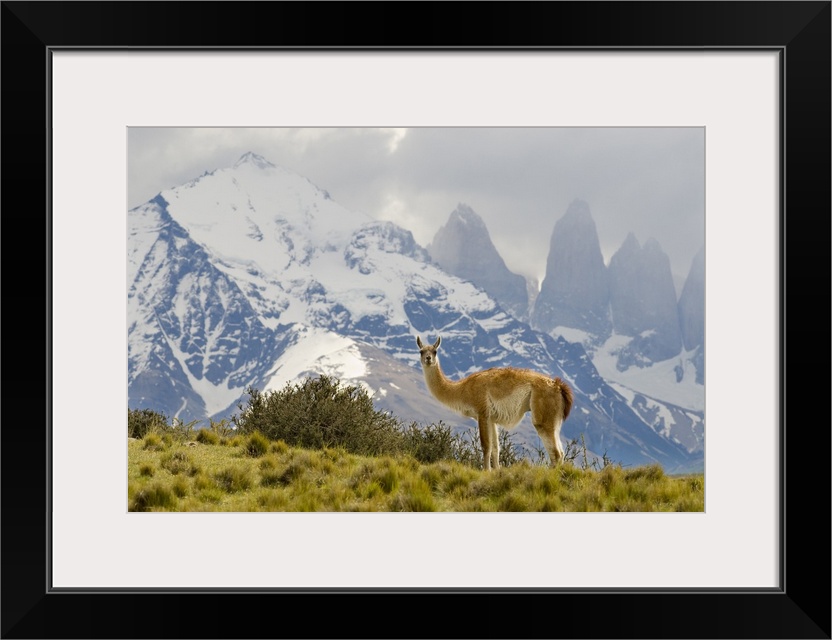 <p>Guanaco with Paine Towers in background, Torres Del Paine National Park, Region 12, Chile, Patagonia.</p>