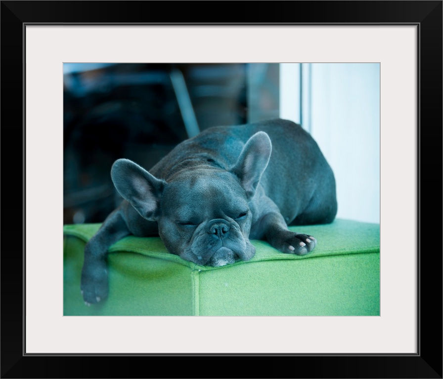 <p>A sleeping french bull dog on a green cushion in a store window.</p>