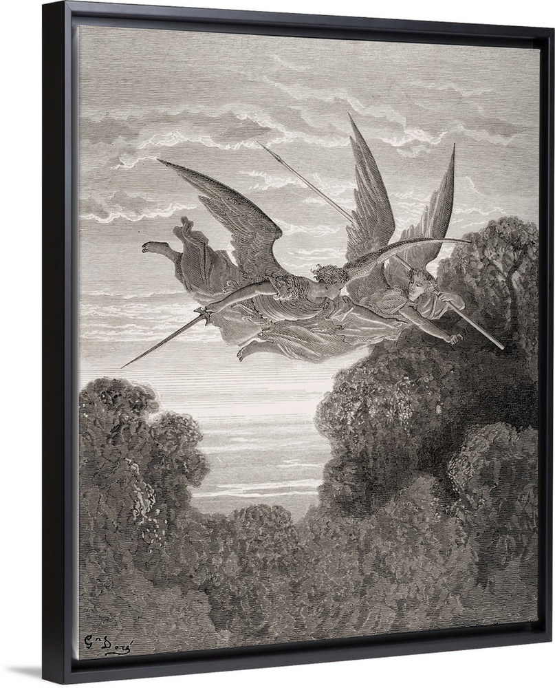 <p>Engraving By Gustave Dore, 1832-1883, French Artist And Illustrator, For Paradise Lost By John Milton, Book IV, Lines 798 And 799. Guardian Angels Zephon And Ithuriel.</p>