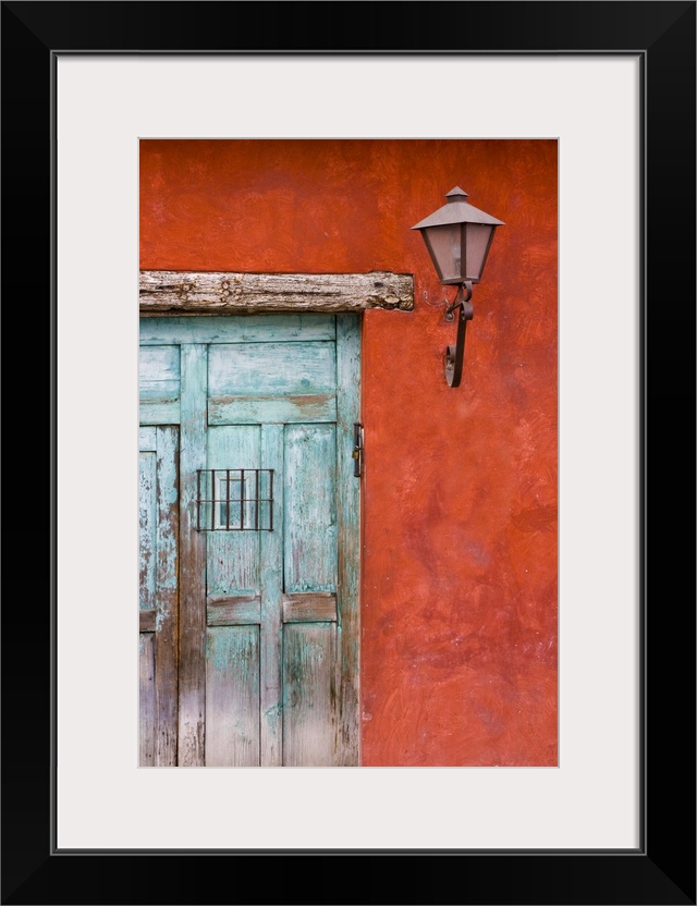 <p>Central America, Guatemala, Antigua. Aqua blue door against colorful red wall in Antigua.</p>