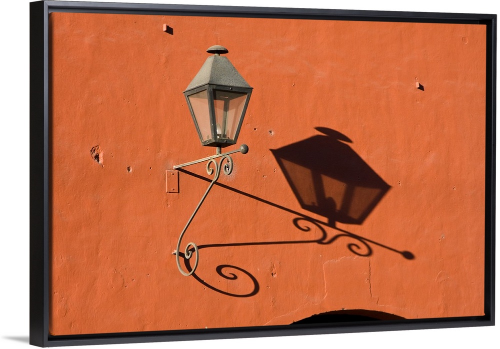 <p>Central America, Guatemala, Antigua. A lantern with shadow on a colorful wall in the town of Antigua.</p>