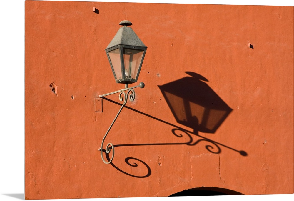<p>Central America, Guatemala, Antigua. A lantern with shadow on a colorful wall in the town of Antigua.</p>