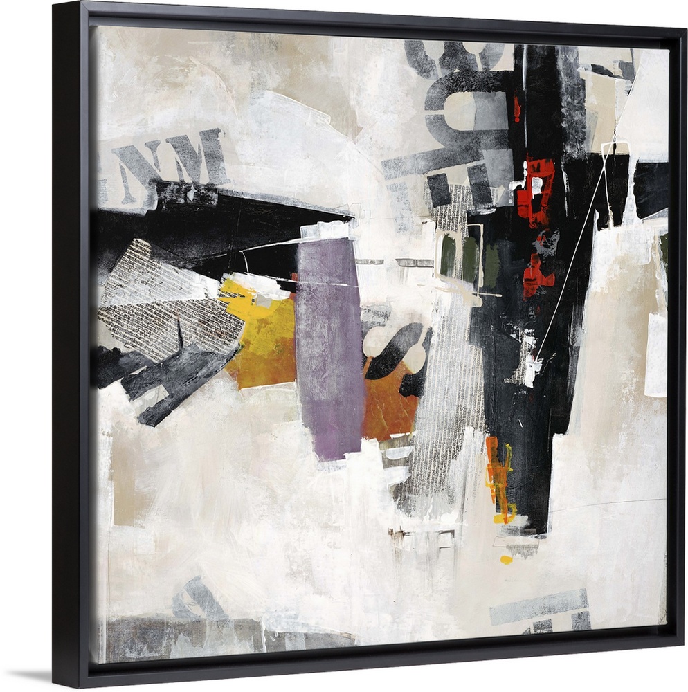 <p>Abstract art of overlapping stenciled letters and pieces of newsprint, placed randomly among patches of contrasting colors.</p>