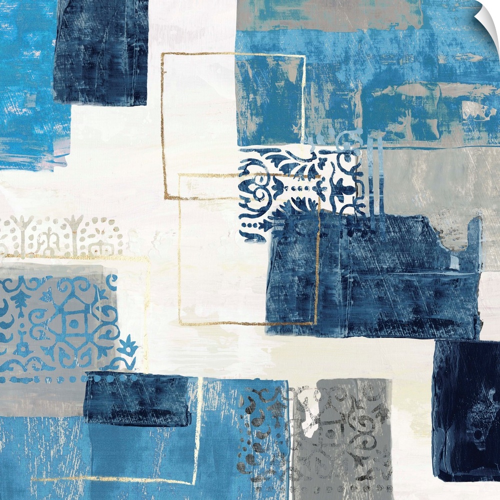 <p>Bohemian abstract painting in a variety of blue and gray tones with metallic accents.</p>