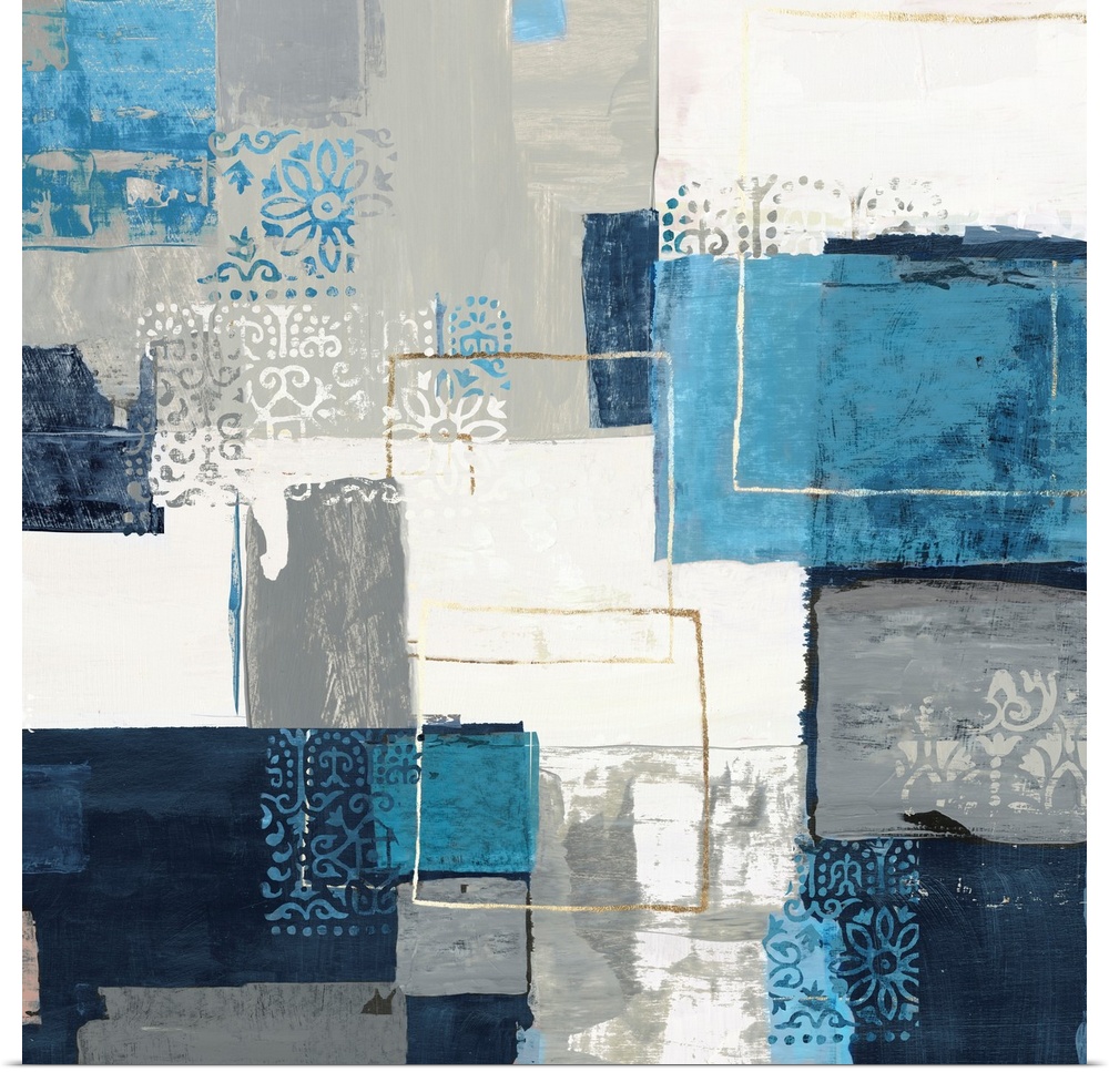 <p>Bohemian abstract painting in a variety of blue and gray tones with metallic accents.</p>