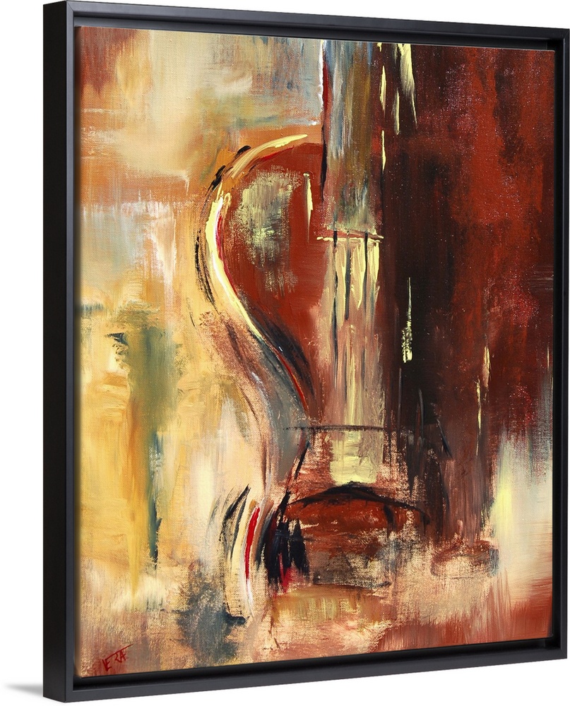 <p>A vertical abstract painting of a violin with muted colors of red and yellow.</p>