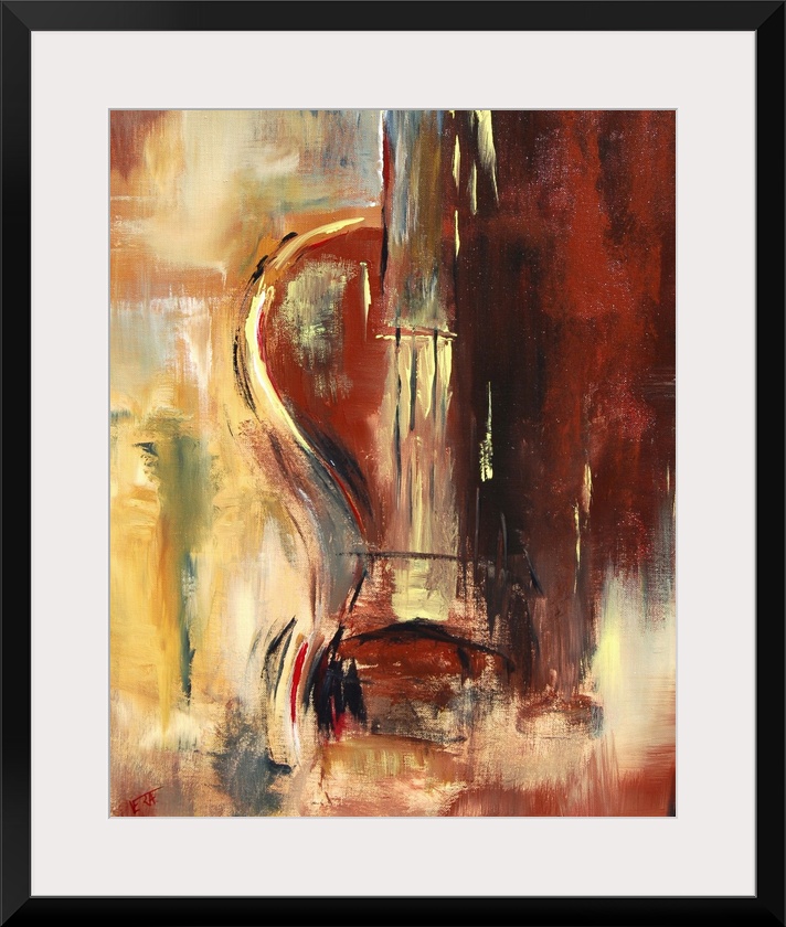 <p>A vertical abstract painting of a violin with muted colors of red and yellow.</p>