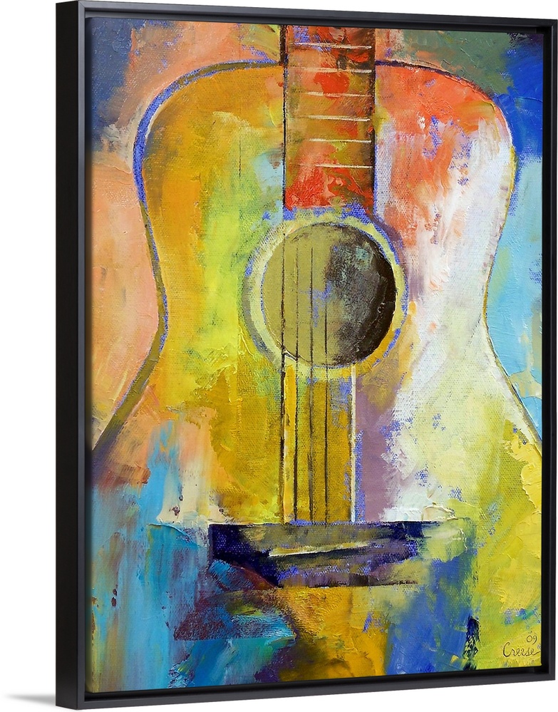 <p>Large contemporary art focuses on the body and strings of a popular musical instrument through the use of vibrant colors.</p>