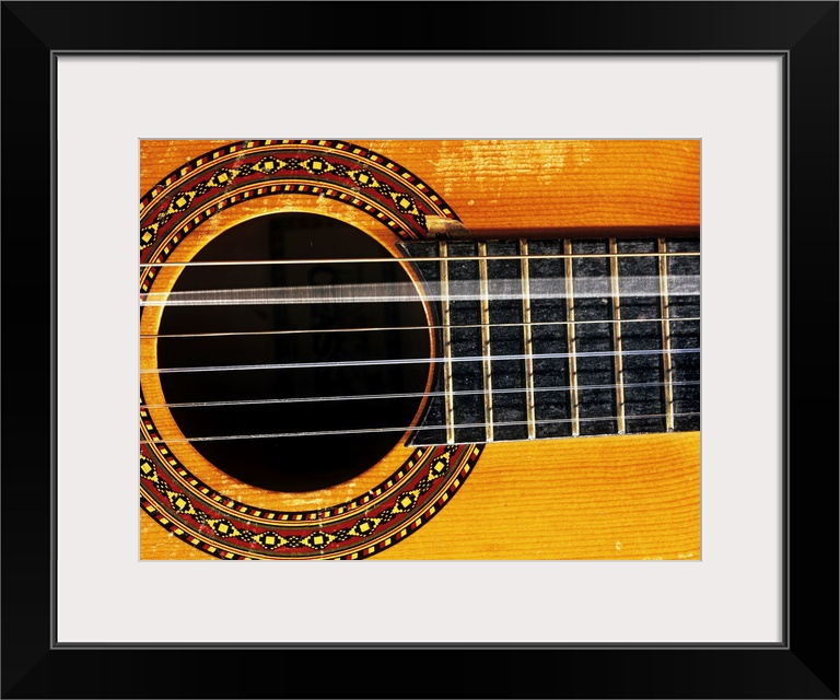 <p>Guitar string vibrating. When plucked, the string vibrates at a specific frequency, which determines the pitch of the note. The vertical lines on the fretboard (centre right) of the guitar mark where fingers should be placed to shorten or lengthen the vibrating part of the string. Shortening the string produces a note with a higher pitch, lengthening it lowers the note. The vibration of the string itself does not create much sound, but the strings in turn cause the top plate of the guitar to vibrate, which is much louder. The hole at centre left allows these amplified sound waves to escape.</p>