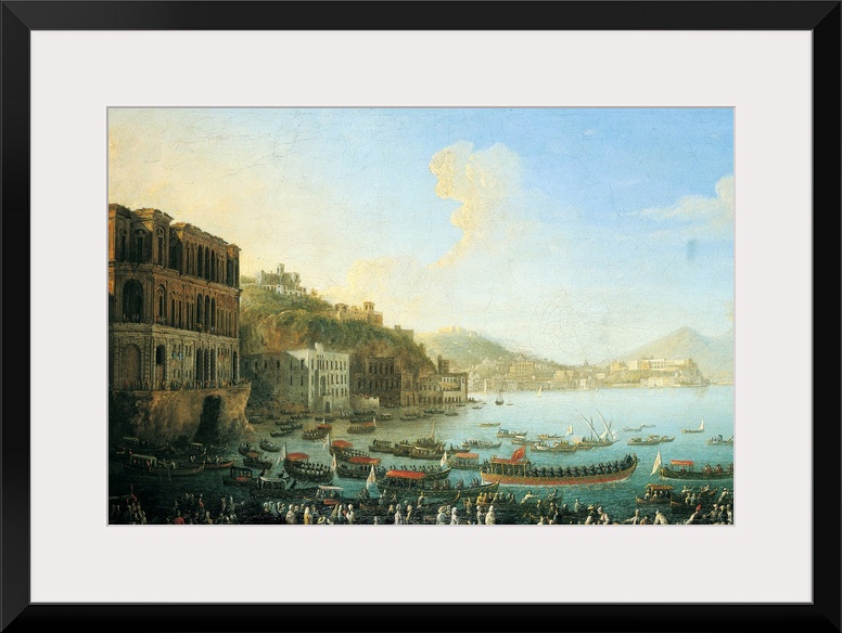 <p>View of Naples with Palazzo Donn'Anna (Veduta di Napoli con Palazzo Donn'Anna), by Antonio Joli, 18th Century, oil on canvas, Whole artwork view. Wide shot of the gulf of Naples with royal boats and galleys, under the curious eyes of a crowd of countrymen and countrywomen; on the left, at the beginning of Posillipo Street, stands out the majestic Palazzo Donn'Anna, one of the most famous edifices in Naples, which dates back to the 17th Century; on the background, the Vesuvius., Oil on canvas.</p>