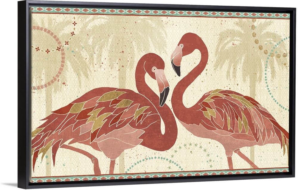 <p>Contemporary artwork of two flamingos in dark pink, tones with gilded feathers against a tropical themed background.</p>