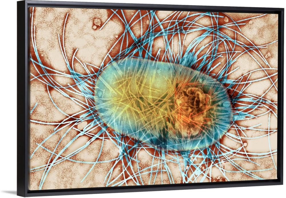 <p>Gut bacterium. Coloured transmission electron micrograph (TEM) of a bacterium from the family Enterobacteriaceae. This family comprises Gram- negative rod-shaped bacteria, most of which have flagellae (hair-like strands) that are used for movement. Many are a normal part of the gut flora found in the intestines, but some are pathogenic, such as Salmonella enterica and certain strains of Escherichia coli, and can cause foodborne illnesses. Magnification: x27,200 when printed 10 centimetres wide.</p>