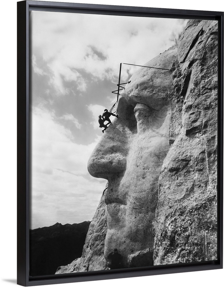<p>Gutzon Borglum inspecting work on the face of President Washington, Mt. Rushmore, South Dakota.</p>
