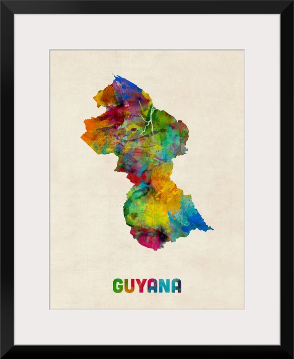 <p>Watercolor art map of the country Guyana against a weathered beige background.</p>